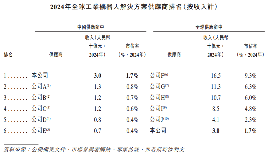按2024年收入计,公司于全球工业机器人解决方案市场在国内供货商中排名第一,于全球工业机器人解决方案市场在全球所有供货商中排名第六。