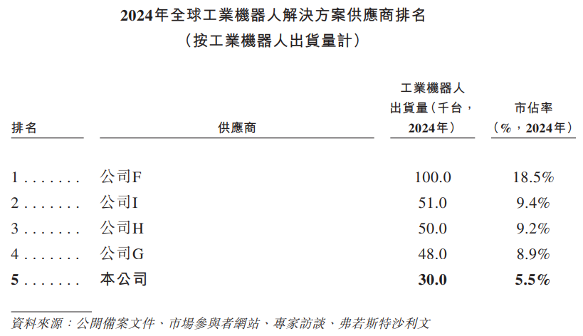 按2024年工业机器人出货量计,公司于全球工业机器人解决方案市场在全球所有供货商中排名第五,市场份额为5.5%。