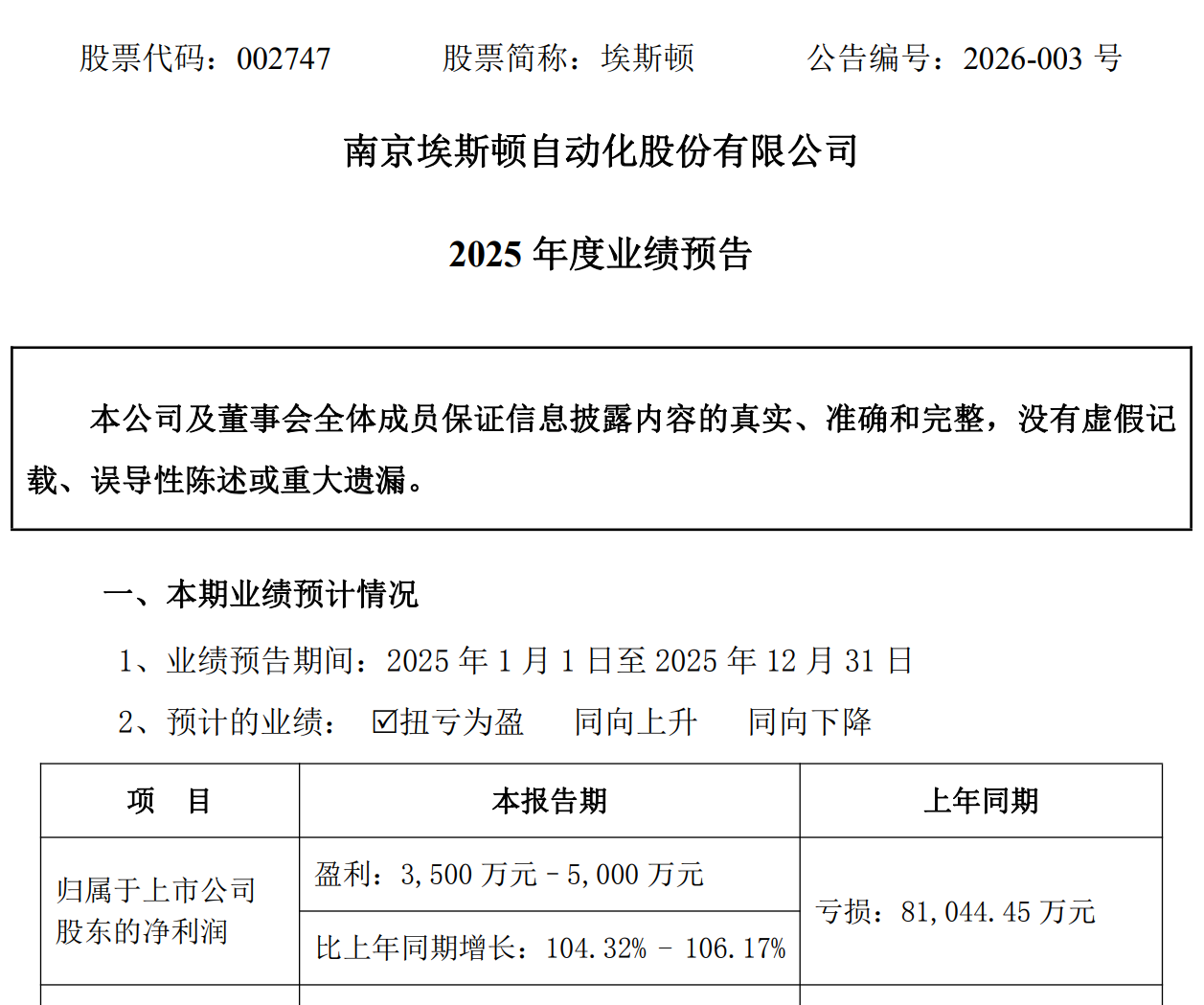 埃斯顿在A股披露的业绩预告显示,2025年,公司预计扭亏为盈,归属于上市公司股东的净利润为3,500 万元–5,000 万元,同比上年增长104.32%- 106.17%。