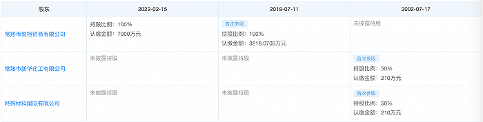 誉翔贸易全资控股新特化工前,常熟市新华化工有限公司(简称“新华化工”)、特殊材料国际有限公司连续多年为新特化工股东,双方各持股50%。