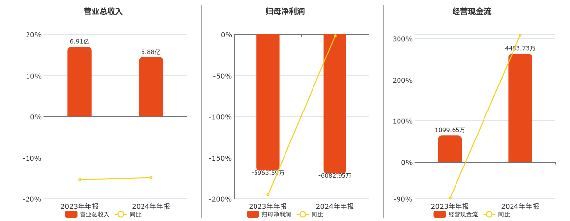 公司营业总收入为5.88亿元,较去年同报告期营业总收入减少1.03亿元,同比较去年同期下降14.87%。归母净利润为-6082.95万元,较去年同报告期归母净利润减少119.35万元。经营活动现金净流入为4483.73万元。
