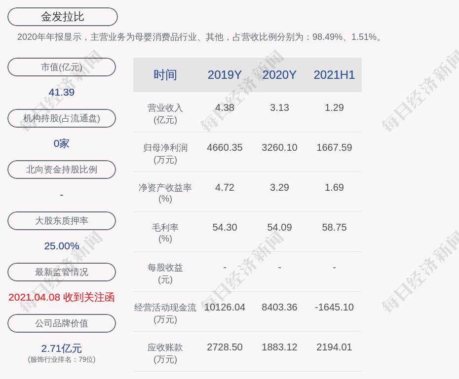 2020年年报显示,金发拉比的主营业务为母婴消费品行业、其他,占营收比例分别为:98.49%、1.51%。