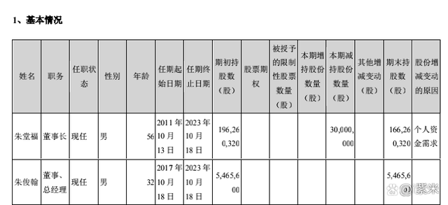 董事长朱堂福报告期间因个人资金需求减持30,000,000股,期末持股数166,260,320。