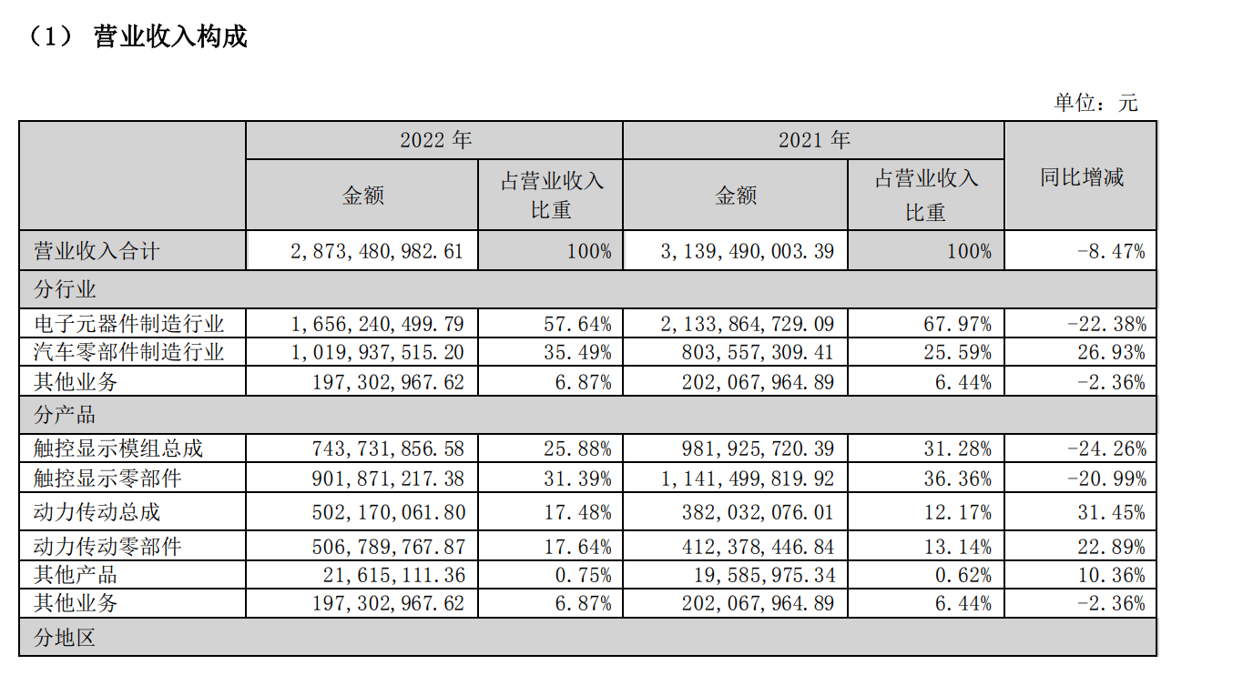 重庆台冠是蓝黛科技在触控显示业务布局的两家重要子公司之一。3月27日晚间同时披露的2022年业绩显示,去年,蓝黛科技的触控显示业务营业收入占公司整体营收的比例将近6成,但公司整体营收和触控显示业务的营收在2022年双双同比下滑。