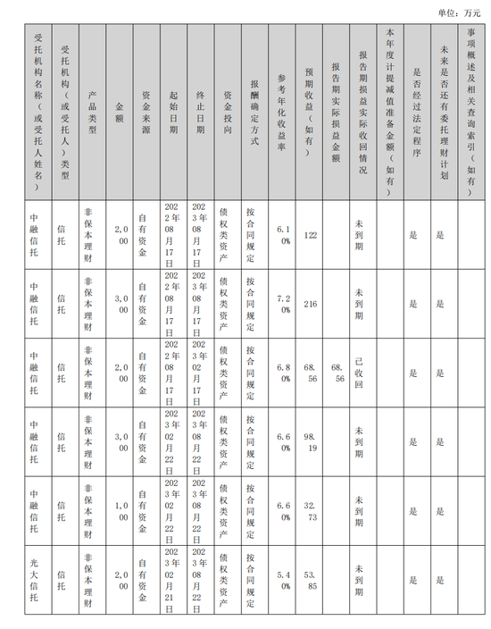先锋电子日前披露的2023年半年报显示,公司信托理财产品发生额共计1.3亿元,分别为购入了中融信托5个产品共计1.1亿元,和光大信托1个产品共2000万元。所购的中融信托5个产品中,4个产品已经先后公告逾期兑付,共计本金9000万元;但有一个今年2月17日到期的中融信托产品本金2000万元完成了赎回,并取得收益68.56万元。