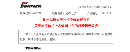事隔两天后,先锋电子再度公告所购中融信托产品逾期。8月23日晚间先锋电子公告,2023年2月22日,先锋电子使用3000万元、全资子公司昇锋投资使用1000万元分别购买了中融信托的鸿榕1号信托产品,预期年化收益率为6.60%,存续期限为6个月。截至公告披露日,上述信托产品本金及投资收益尚未收回,存在本息不能全部兑付或者仅部分兑付的风险。