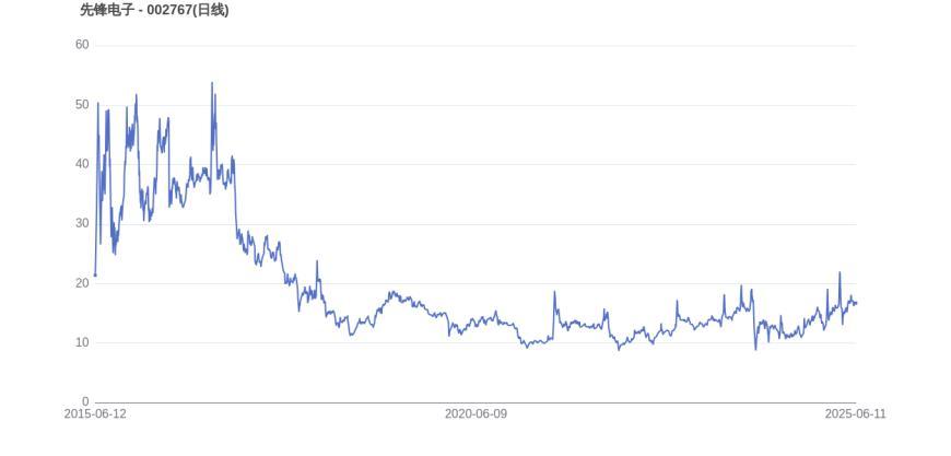 2016年12月21日,先锋电子的市值巅峰达到81.03亿元,股价也顺应升至54.02元。而至6月11日收盘,先锋电子的股价为16.75元,市值为25.12亿元,相比峰值时期市值减少55.91亿元,市值蒸发了68.99%。
