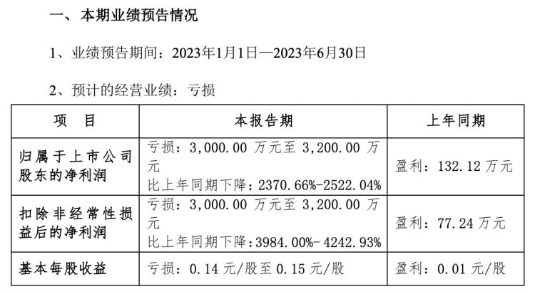 据公司2023年半年度业绩预告,公司预计上半年净亏损3000万元至3200万元,去年同期归母净利润132.12万元。