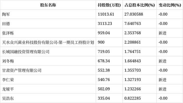 三季报显示,2022年三季度末的公司十大流通股东中,新进股东为张泽栎、刘冬梅、李仁荣、龙娅平,取代了二季度末的雷小刚、叶福林、法国兴业银行、安徽中安资本投资基金有限公司。在具体持股比例上,陶军、田德、天水众兴菌业科技股份有限公司-第一期员工持股计划、长城国融投资管理有限公司、甘肃资产管理有限公司、吴浩东持股有所下降。