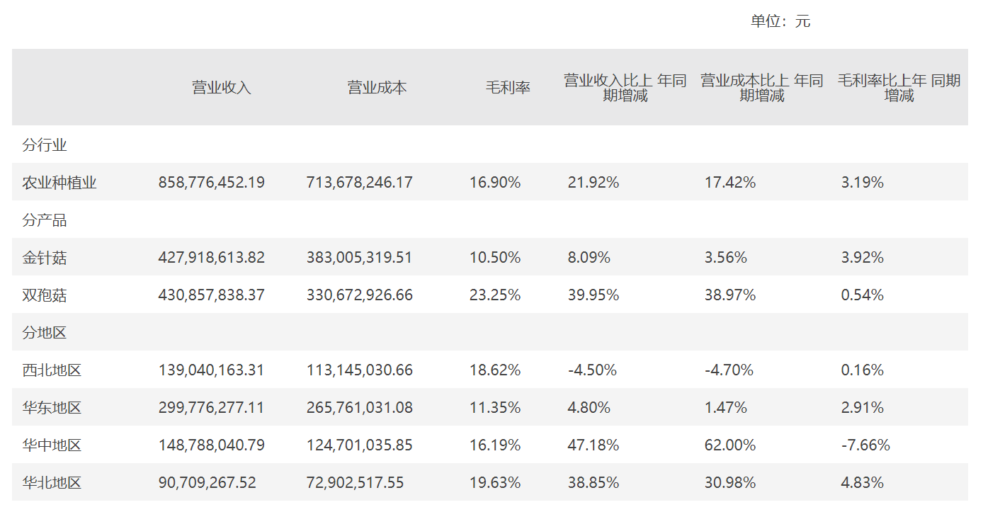 根据上表可知,双孢菇的毛利率为23.25%,显著高于金针菇10.5%的毛利率;同时,今年上半年,众兴菌业双孢菇的产品营收也超过了金针菇。