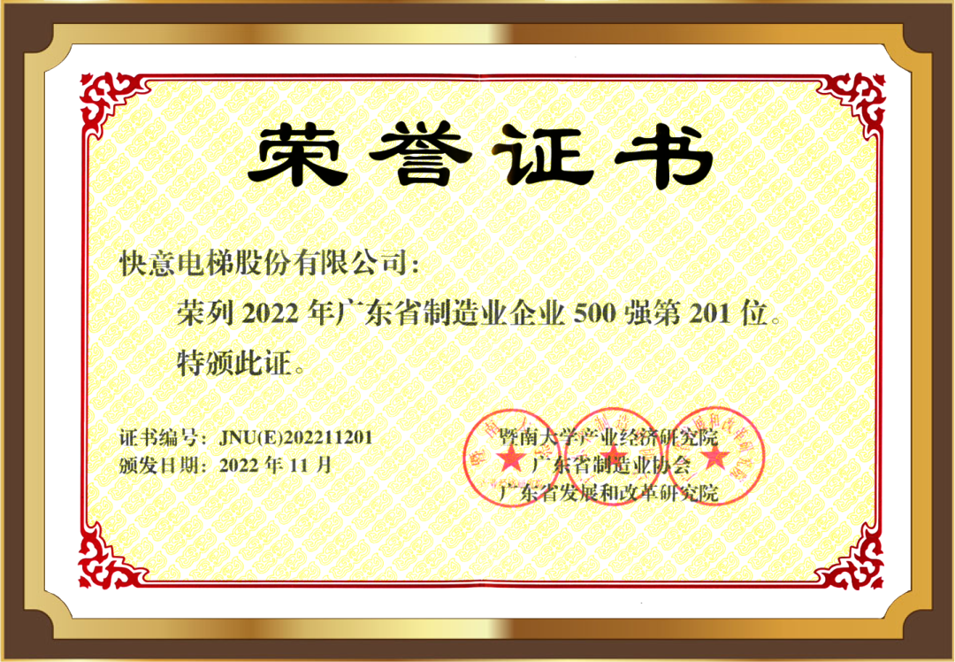继连续两年荣登“中国电梯制造商10强”榜单后,近期,快意电梯荣登2022年广东省制造业企业500强榜单,位列第201位。