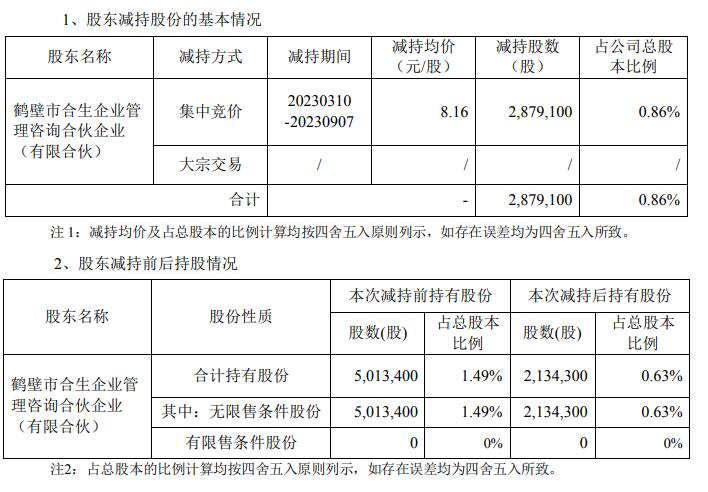 快意电梯公告显示,2023年3月10日至2023年9月7日,合生企业通过集中竞价减持股数2,879,100股,减持均价8.16元,占公司总股本比例0.86%。经计算,合生企业减持金额约为2349.35万元。