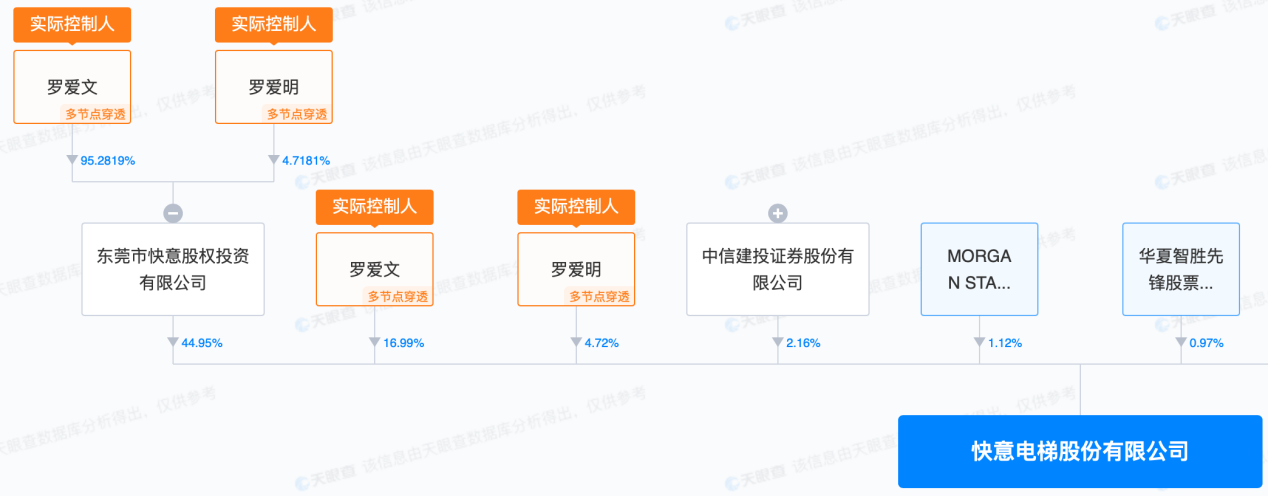 1998年,快意电梯股份有限公司(简称“快意电梯”)正式成立,主要产品包括乘客电梯、载货电梯、自动扶梯和自动人行道等。当下,快意电梯的实际控制人为罗爱文和罗爱明,两人为姐弟关系,罗爱文和罗爱明分别直接持有快意电梯16.99%和4.72%股权,二人通过“东莞市快意股权投资有限公司”间接持股,最终持股比例分别为60.0611%、6.9038%。