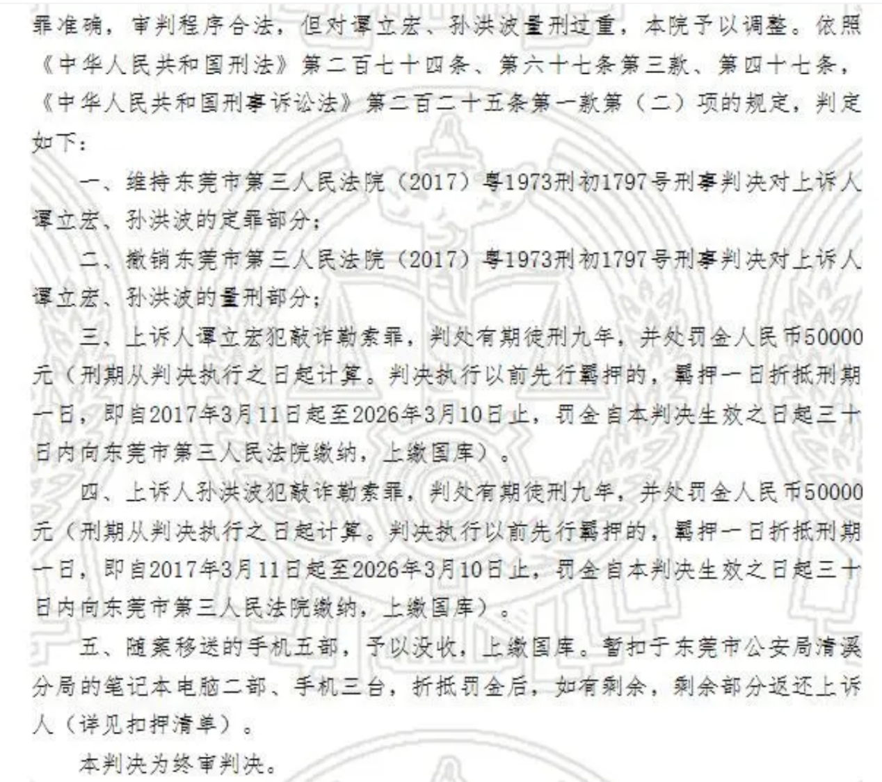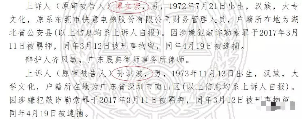 更多公开报道披露,谭立宏曾担任快意电梯的财务部长。按照判决书中上诉人谭立宏及辩护人的说法,谭立宏曾与快意电梯的董事长罗某(受害人)存在劳资纠纷。谭立宏怀恨在心,趁快意电梯公司即将上市的机会,离职时私自带走财务资料,想用此资料向罗某索要钱财。孙洪波及辩护人称,自己有检举快意电梯公司偷税漏税的立功表现。