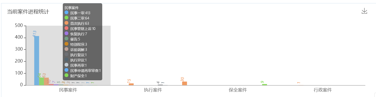 关于当前案件的进程,民事案件中共有413起为民事一审状态,63起为首次执行状态,64起为民事二审状态,民事管辖上诉10起,恢复执行7起。