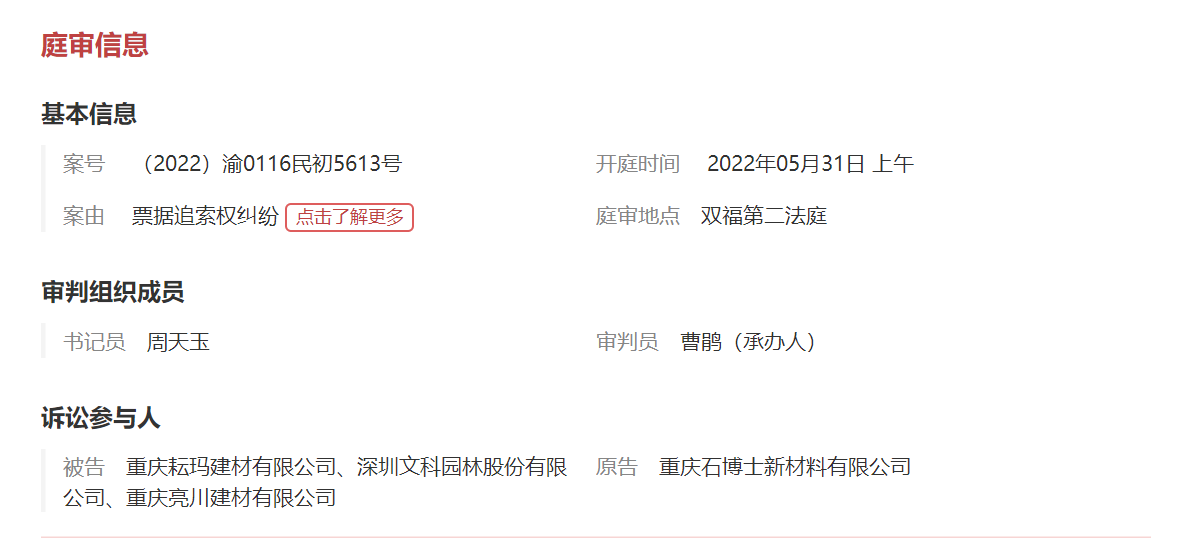 案件原告为重庆石博士新材料有限公司,被告为深圳文科园林股份有限公司、重庆亮川建材有限公司等。案件案号为(2022)渝0116民初5613号。