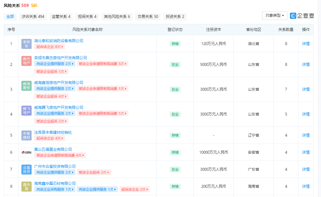 纵观其风险关系对象,涉及企业282个,当中不乏房地产企业,包括荣成市鼎杰房地产开发有限公司、威海腾飞房地产开发有限公司、黄山五福置业有限公司等;此外还涉及人员221人。