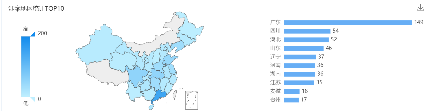涉案地区大部分集中在广东达149起。另外四川、湖北、山东、辽宁、河南、湖南、江苏、安徽、贵州均有涉及。