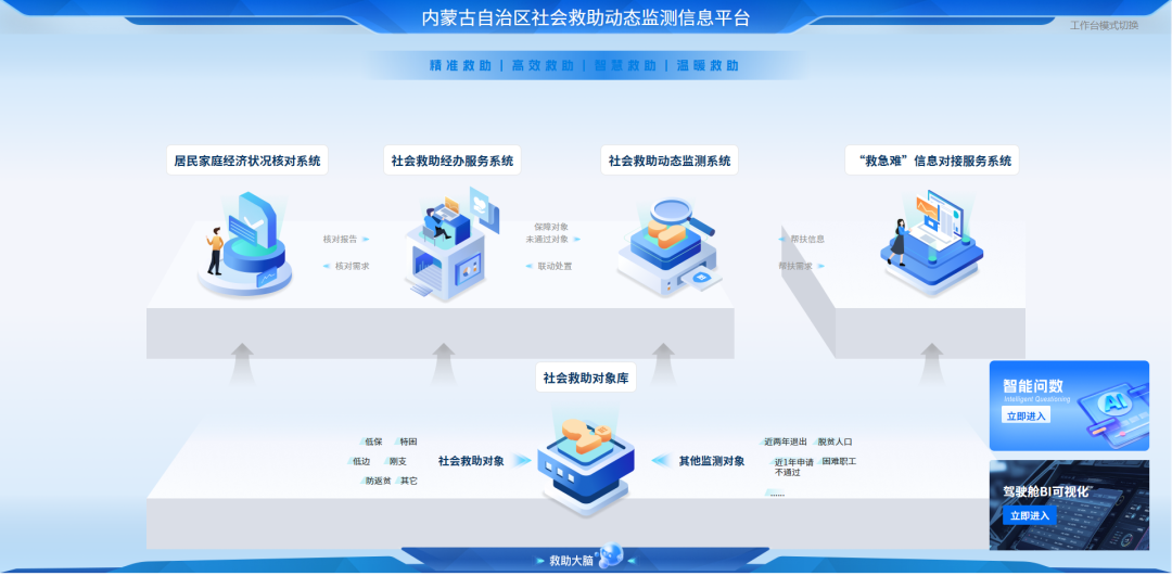 久远银海 与 内蒙古自治区民政厅 深度协作,严格遵循民政部“一网、一库、一平台”建设要求,打造“1+3+1”社会救助动态监测信息平台,创新构建“一体一库四闭环”的内蒙古救助服务新模式。平台实现全区“一级部署、五级贯通”,向上融入全国救助“一张网”,向下贯通12个盟市、103个旗县及万余个乡镇、村,纳入各类监测对象246万余人,让救助服务触达基层“最后一公里”。