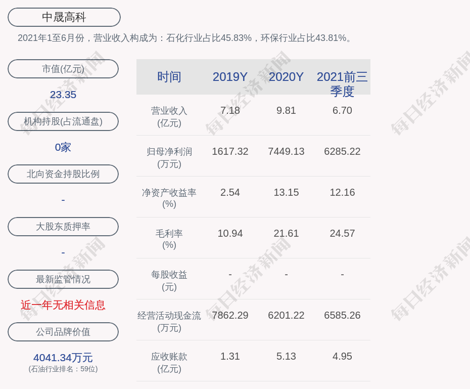 2021年1至6月份,中晟高科的营业收入构成为:石化行业占比45.83%,环保行业占比43.81%。