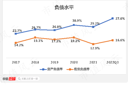 负债情况同样不乐观,近年来呈上升趋势,2022年前三季度末资产负债率与有息负债率分别为37%和16.6%。