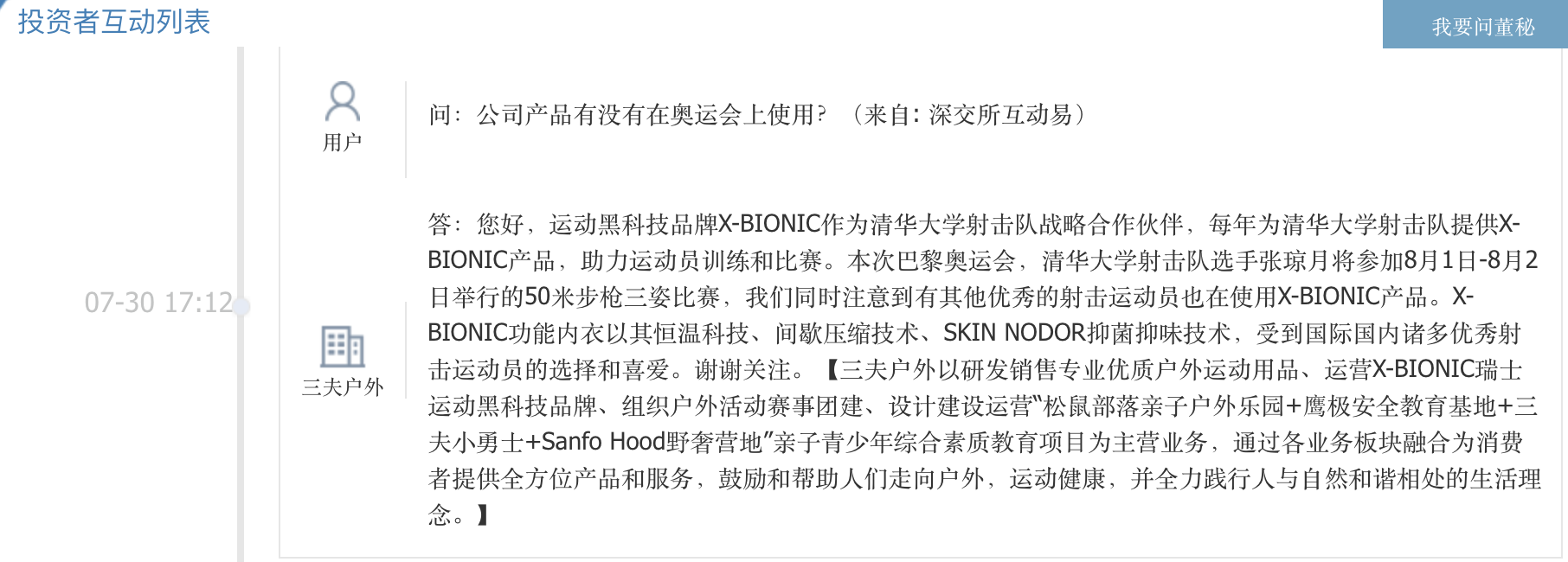 公开信息显示,三夫户外2016年12月9日上市,主营系研发销售专业优质户外运动用品、组织户外活动赛事团建,构建亲子青少年综合户外素质教育体验平台。