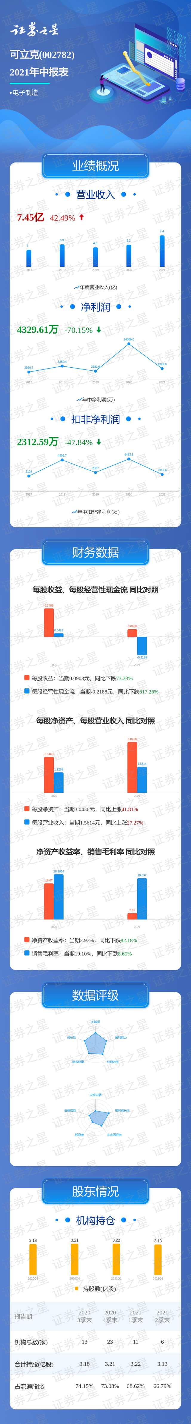 可立克2021中报显示,公司主营收入7.45亿元,同比上升42.49%;归母净利润4329.61万元,同比下降70.15%;扣非净利润2312.59万元,同比下降47.84%;负债率27.2%,投资收益4030.23万元,财务费用144.99万元,毛利率19.1%。