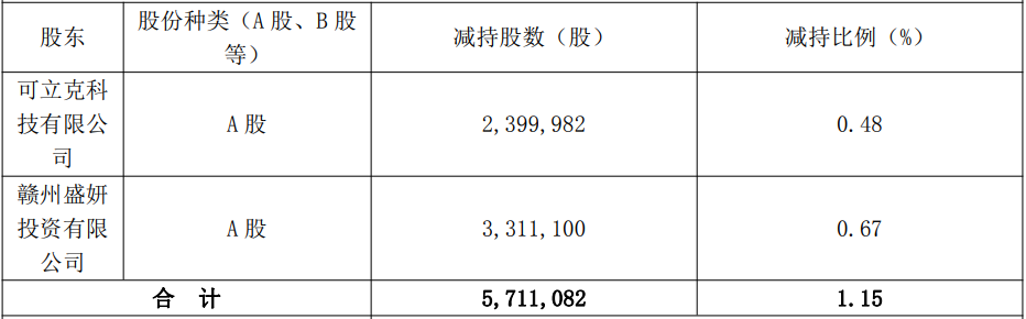 公司于近日收到控股股东赣州盛妍投资有限公司(简称“盛妍投资”)、控股股东的一致行动人可立克科技有限公司(简称“可立克科技”)出具的《减持股份的告知函》,获悉盛妍投资于2025年8月26日至2025年8月29日,累计减持公司股份3,311,100股,占公司总股本的0.67%,其中通过集中竞价交易减持公司股份2,441,100股,占公司总股本的0.49%,通过大宗交易方式减持公司股份87,000股,占公司总股本的0.18%。可立克科技于2025年8月27日至2025年9月1日通过集中竞价交易方式累计减持公司股份2,399,982股,占公司总股本的0.48%。