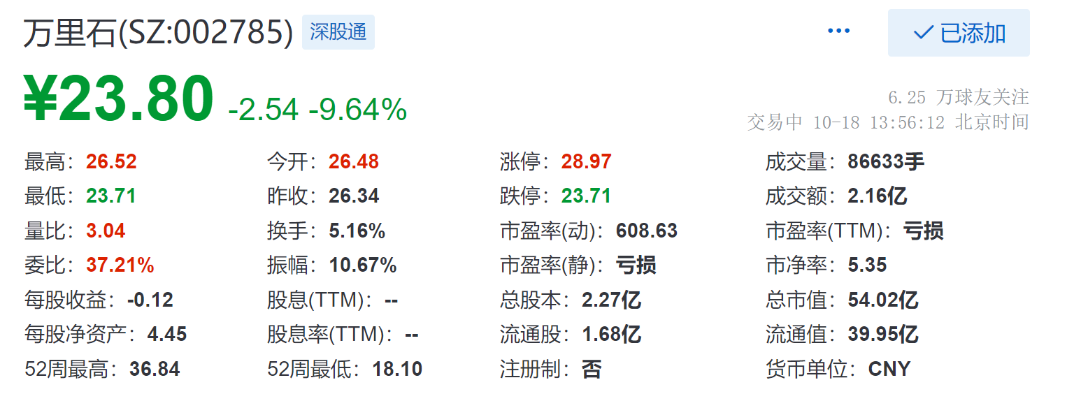 10月18日,截至13:56,万里石(SZ:002785)跌9.64%,报23.8元,成交额为2.16亿元,总市值为54.02亿元。