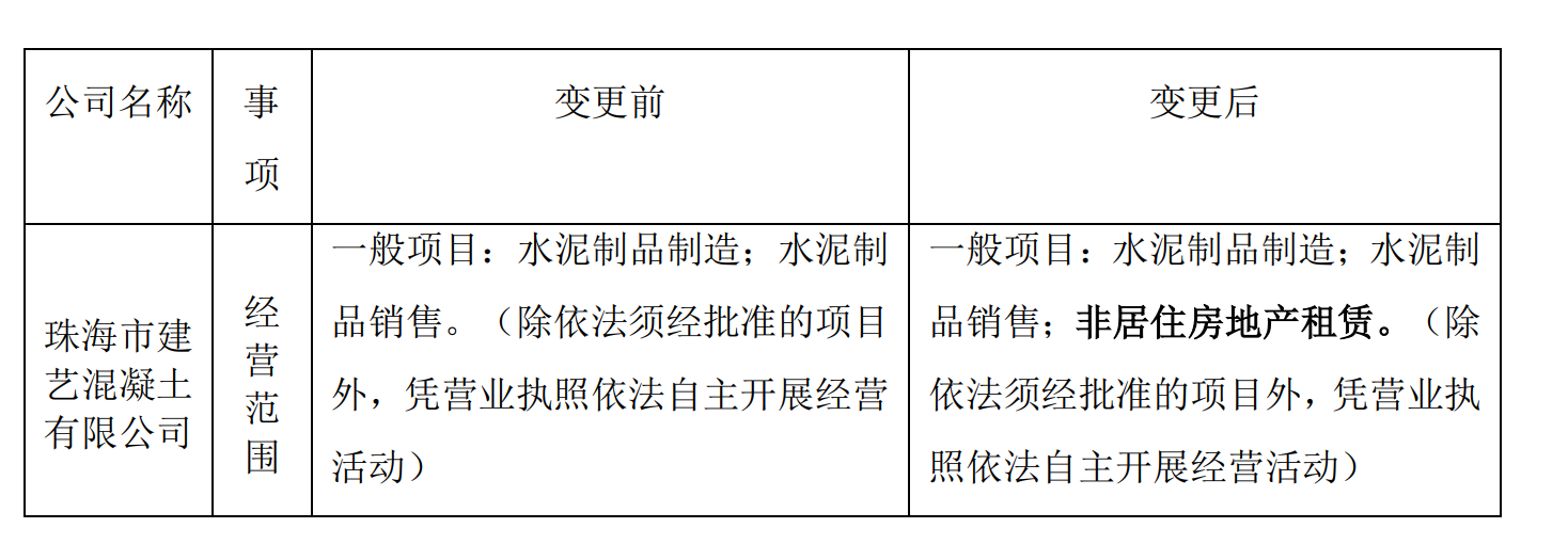 公告显示,建艺集团于近日接到全资子公司珠海市建艺混凝土有限公司(以下简称“建艺混凝土”)的通知,因其经营需要变更经营范围,并已完成相关工商登记变更及备案手续。建艺混凝土经营范围新增非居住房地产租赁。除上述变更外,建艺混凝土的其他工商事项未发生变化。