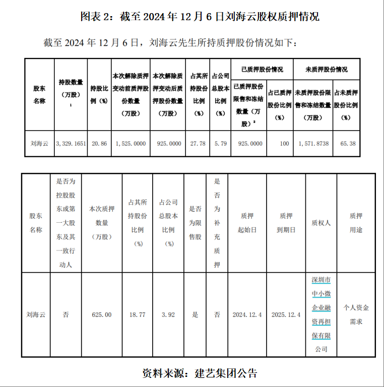 根据建艺集团发布的《关于持股 5%以上股东部分公司股份解除质押的公告》,截至2024年12月6日,刘海云共持有建艺集团3329.1615万股股份,其中925万股已质押,占建艺集团总股份数的5.79%。