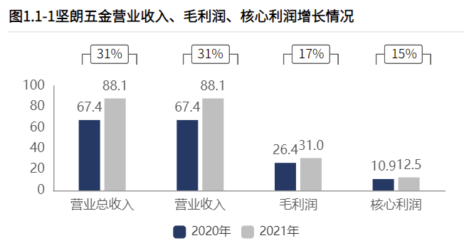 2021年营业总收入88.07亿元,其中营业收入88.07亿元,较2020年增加20.70亿元,销售收入快速增长;2021年毛利润31.04亿元,较2020年增加4.59亿元,毛利润增长;2021年核心利润12.52亿元,较2020年增加1.65亿元,核心利润增长。