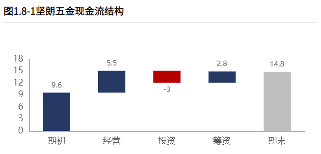 坚朗五金2021年经营活动现金净流入5.46亿元,投资活动净流出2.97亿元,筹资活动净流入2.78亿元,本年度共实现5.23亿元的现金净流入。