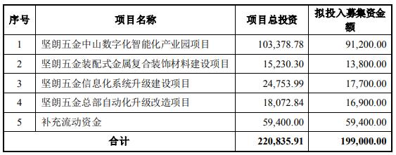 4月15日,坚朗五金发布向特定对象发行A股股票预案。本次发行募集资金总额不超过199000.00万元(含本数),扣除发行费用后的募集资金净额将全部用于坚朗五金中山数字化智能化产业园项目、坚朗五金装配式金属复合装饰材料建设项目、坚朗五金信息化系统升级建设项目、坚朗五金总部自动化升级改造项目、补充流动资金。
