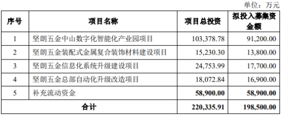 坚朗五金昨晚同时披露的向特定对象发行A股股票募集说明书(修订稿)显示,公司本次发行募集资金总额不超过198,500.00万元(含本数),扣除发行费用后的募集资金净额拟用于以下项目:坚朗五金中山数字化智能化产业园项目、坚朗五金装配式金属复合装饰材料建设项目、坚朗五金信息化系统升级建设项目、坚朗五金总部自动化升级改造项目、补充流动资金。