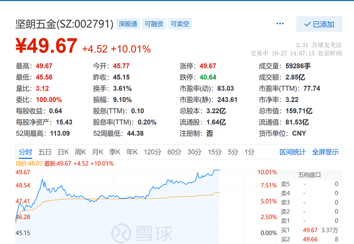 10月27日,截至发稿时,坚朗五金涨停,报49.67元每股,总市值159.71亿元。