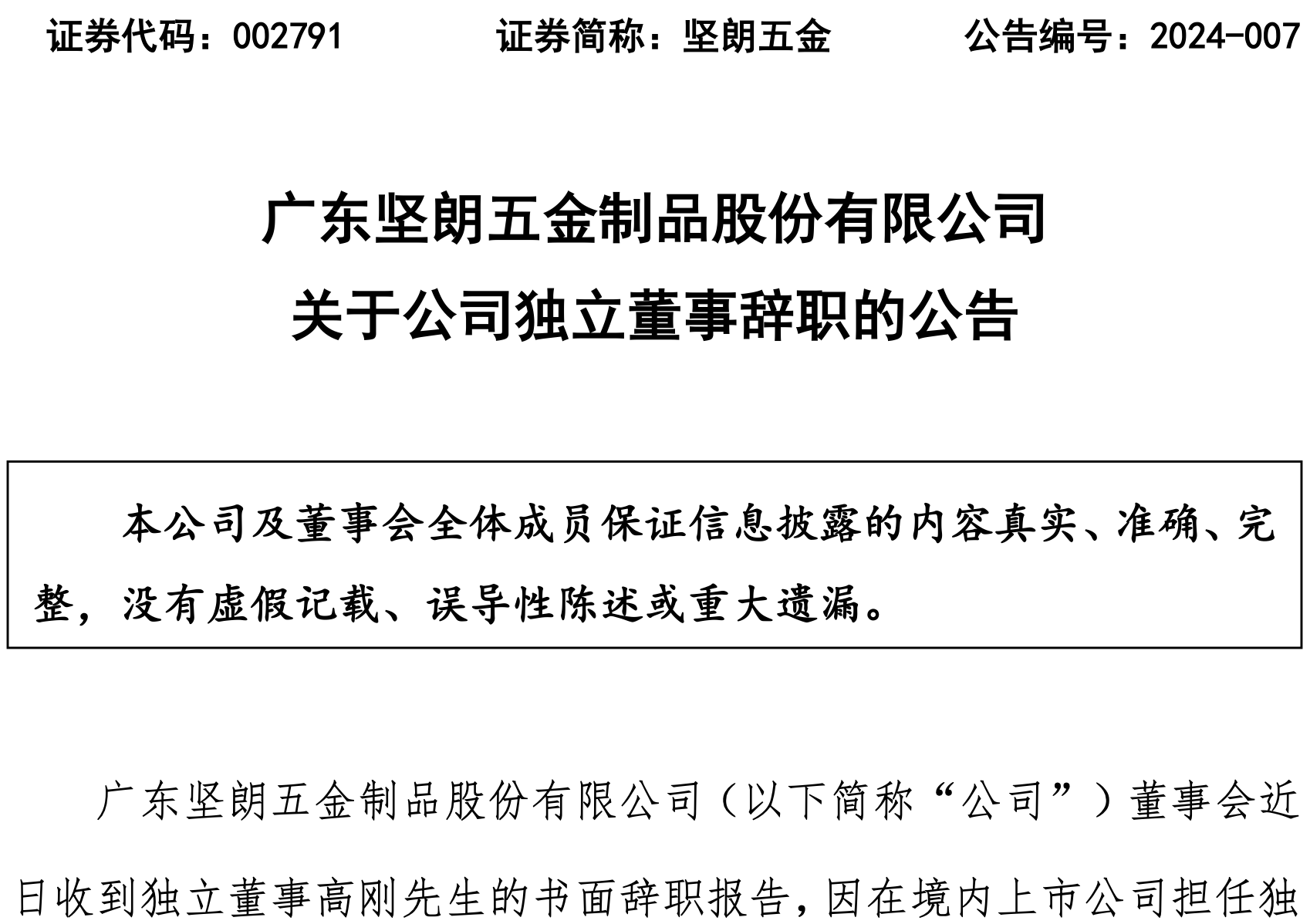3月11日,坚朗五金(002791.SZ)发布公告,高刚申请辞去坚朗五金第四届董事会独立董事、第四届董事会提名委员会主任委员职务。