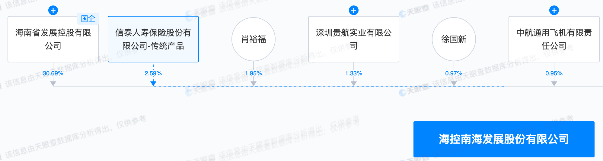 除上述企业外,就目前可查的资料还显示高刚另曾在一家名为“海控南海发展股份”的公司担任高管。海控南海发展股份有限公司(曾用名:中航三鑫股份有限公司),成立于1995年,海南省发展成员,是一家以从事非金属矿物制品业为主的企业。其大股东为“海南省发展控股有限公司”持股比例为30.69%,该公司则由“海南省国有资产监督管理委员会”和“海南省财政厅”分别持股90%和10%。