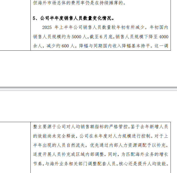 此外,2025年上半年,坚朗五金销售人员数量较年初有所减少。年初国内销售人员规模约为5000人,截至6月底,销售人员规模下降至4000余人,减少约600人,降幅与同期国内收入降幅基本持平。这一调整主要源于公司对人均销售额指标的严格管控。
