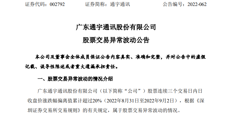 9月4日晚,通宇通讯(002792)出炉股价异动公告称,2022年8月31日至2022年9月2日,公司股票连续三个交易日内日收盘价涨跌幅偏离值累计超过20%,属于股票交易异常波动情况。