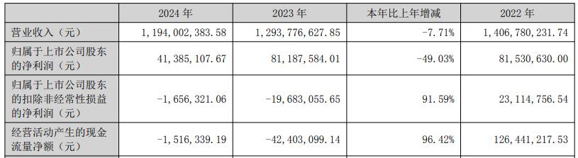 2024年,通宇通讯实现营业收入11.94亿元,同比下降7.71%;归属于上市公司股东的净利润4138.51万元,同比下降49.03%;归属于上市公司股东的扣除非经常性损益的净利润-165.63万元,上年同期为-1968.31万元;经营活动产生的现金流量净额为-151.63万元,上年同期为-4240.31万元。