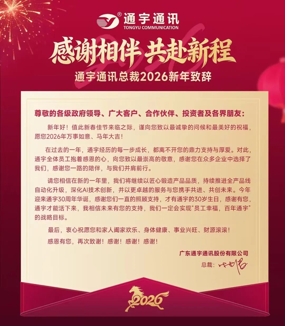 通宇通讯总裁时桂清发表新年致辞:感谢相伴,共赴新程