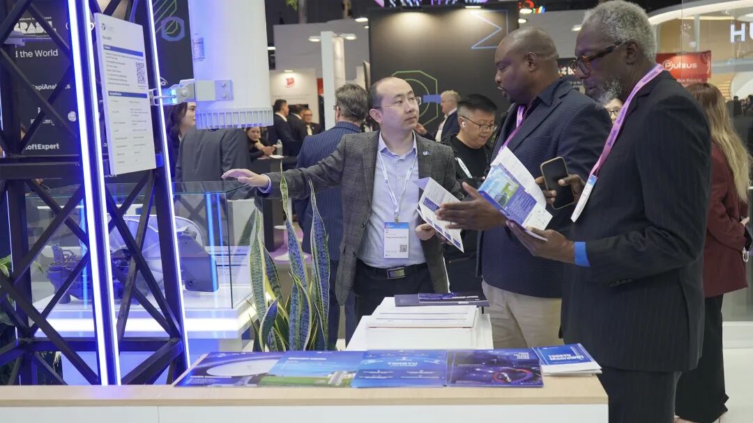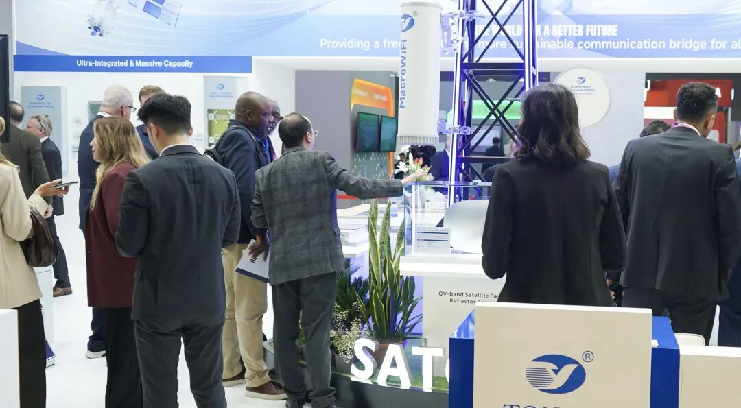在通宇通讯展位中央,卫星有效载荷天线相关产品成为了全球运营商与技术伙伴的关注焦点。作为通宇布局空天地一体化通信的核心技术板块,这里集中展示了通宇在星载通信领域的全套技术解决方案。