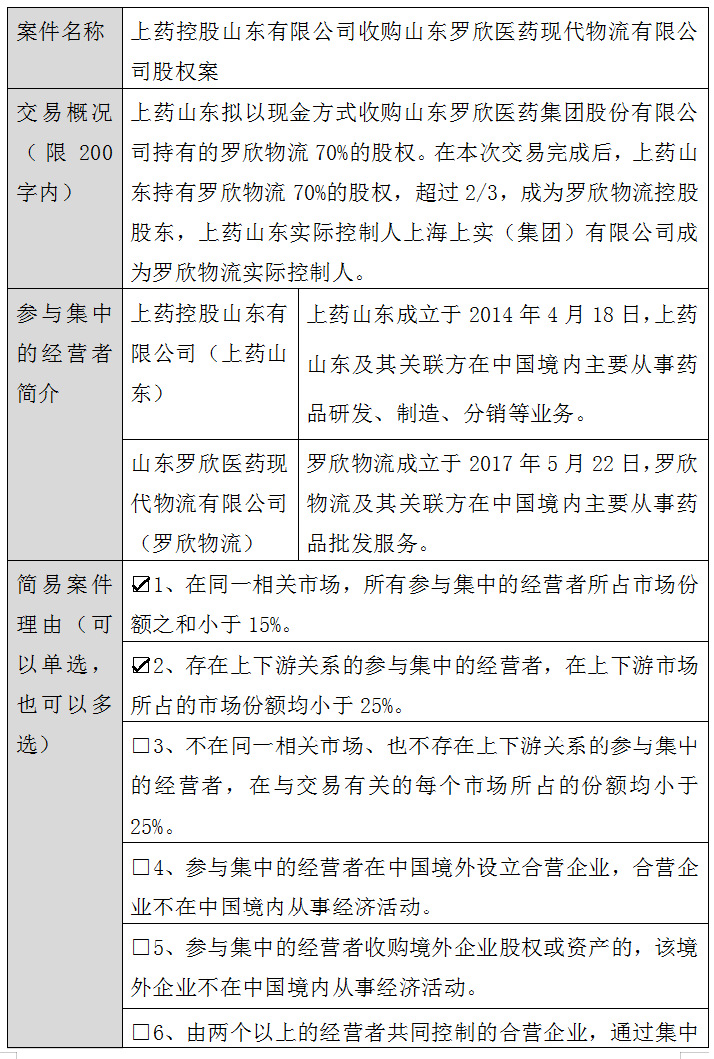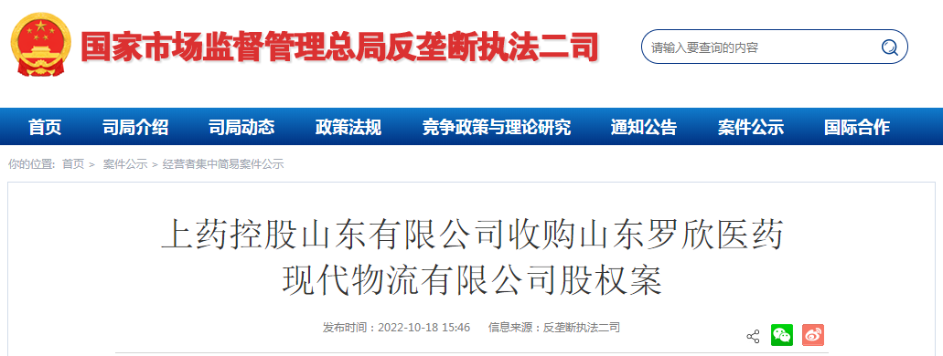 近日(10月18日)国家市监局反垄断执法二司发布了上药控股山东有限公司收购山东罗欣医药现代物流有限公司股权案。