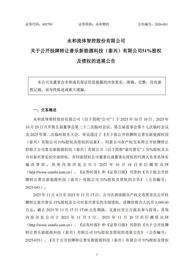 1月7日,永和智控发布关于公开挂牌转让普乐新能源科技(泰兴)有限公司51%股权及债权的进展公告。