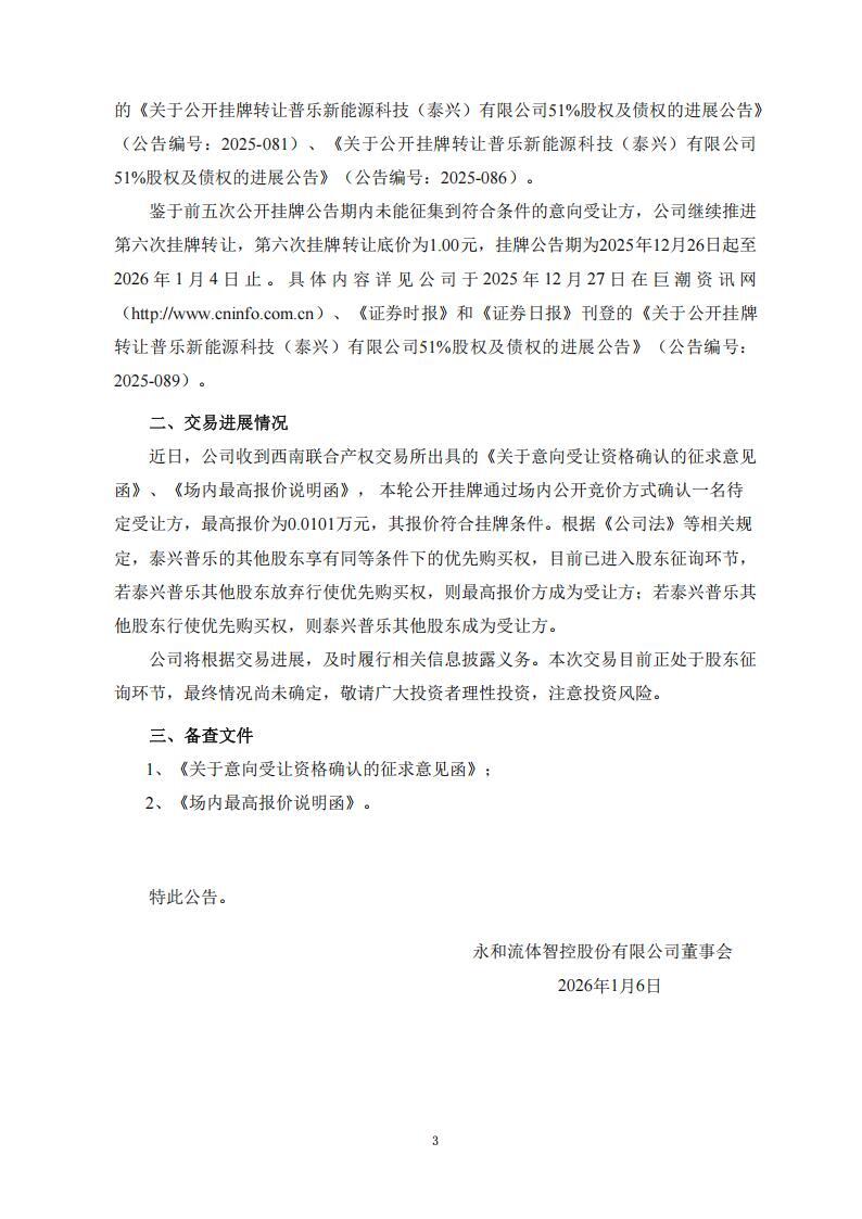 根据公告,2025 年 11 月 4 日至 2025 年 12 月 23日,永和智控在西南联合产权交易所先后6次公开挂牌转让泰兴普乐 51%股权及公司对泰兴普乐的全部债权,挂牌价格从人民币 3,049.00万元降至609.80万元,均未能征集到符合条件的意向受让方。
