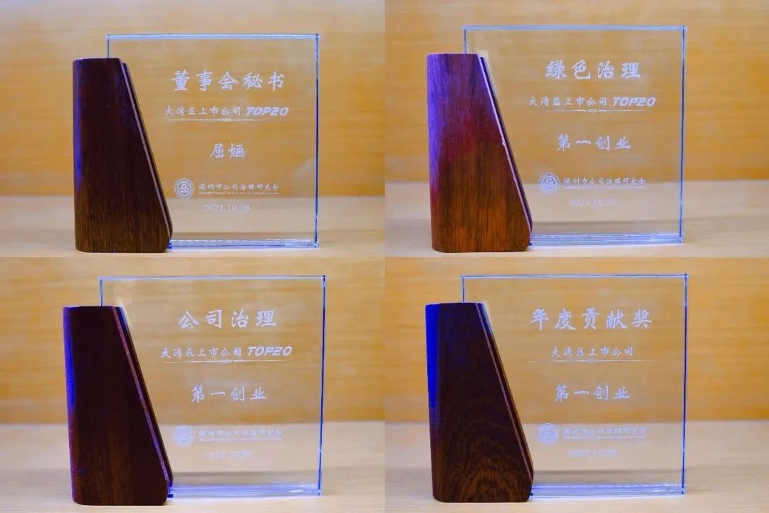 图片说明:第一创业证券董事会秘书屈婳应邀出席第七届中国(深圳)公司治理高峰论坛并领取“2023大湾区上市公司董秘TOP20”“2023大湾区上市公司绿色治理TOP20”“2023大湾区上市公司公司治理TOP20”“2023大湾区上市公司年度贡献奖”奖杯。