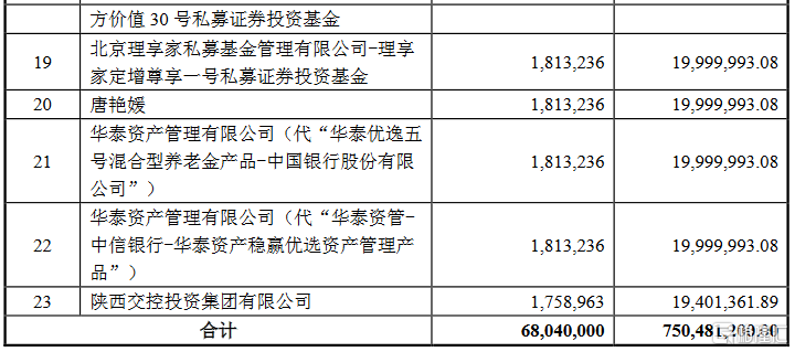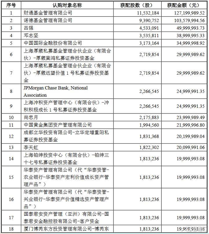 环球印务(002799.SZ)披露非公开发行A股股票发行情况报告书,确定此次发行价格为11.03元/股,发行股数6804万股,募集资金总额约7.5亿元。此次发行对象最终确定为23家,此次发行配售结果如下: