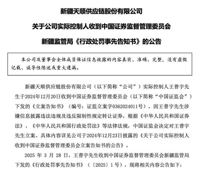 31日晚,天顺股份公告,日前,公司实控人王普宇收到中国证券监督管理委员会新疆监管局下发的《行政处罚事先告知书》。