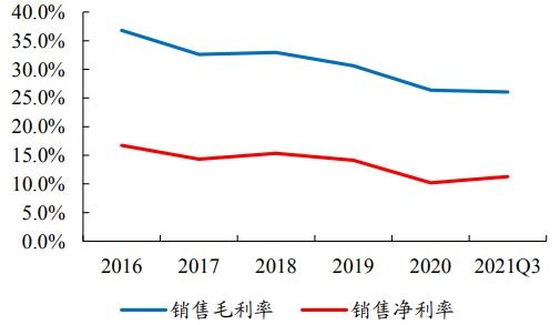 2021年第三季度崇达技术毛利率、净利率(%)